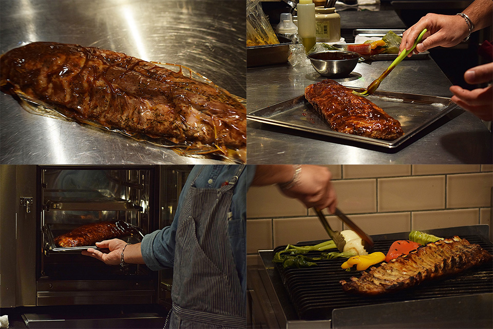 肉の仕込みにかかる時間は、たっぷり約2日間。ハーブでマリネして1日寝かせた肉を、オーブンで2時間程度焼きます。その後、エスプレッソを入れたバーベキューソースに漬け込んで真空状態にした上、さらに寝かせて味を浸透させているのだとか。オーダーを受けたあと、ソースを塗ってオーブンで火を通し、グリルで香ばしく焼き上げます。