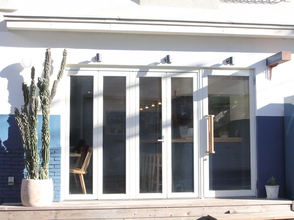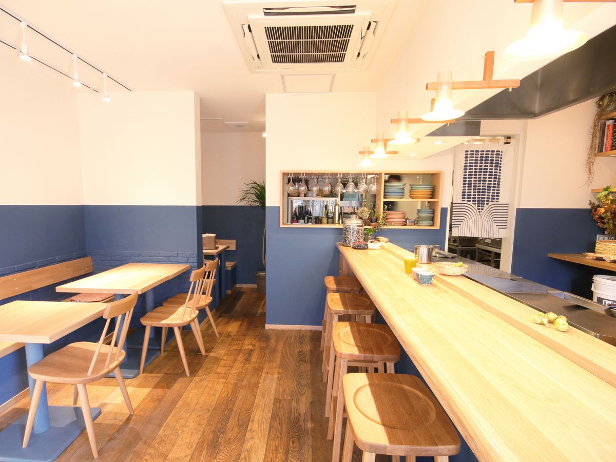 ホワイトとブルーに塗り分けられた壁は大きな窓から入る外光でより明るく見え、ウッドの長いカウンターが “お寿司屋”を連想させると感じる人が多いのだとか。