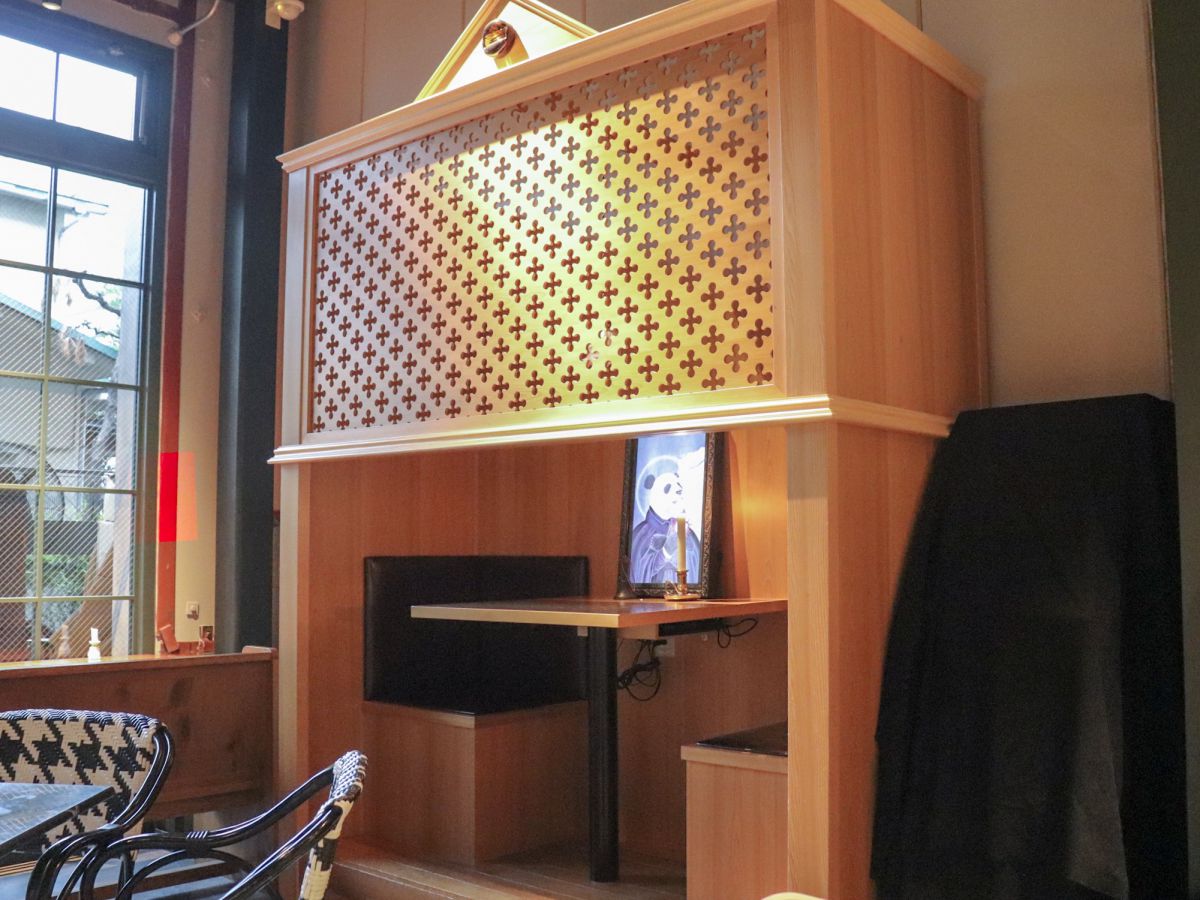 広い店内には、趣向を凝らしたさまざまな客席が。こちらは通称「懺悔室」と呼ばれるボックス席です。教会の懺悔室をイメージした席で、テーブルに置かれたモニターには十字架を持ったかわいらしいパンダの神父の映像が流れています。