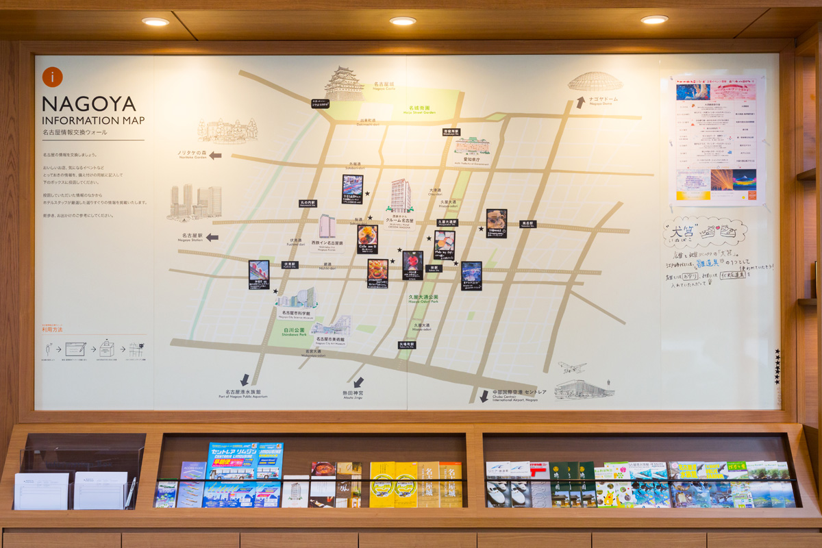 名古屋を知るには、ロビーに設置してある「名古屋インフォメーションマップ」をチェック!主要観光スポットが明記されていたり、イベント情報なども掲載しているのでとっても便利!さらに詳しい情報はコンダクターデスクで尋ねてみて。