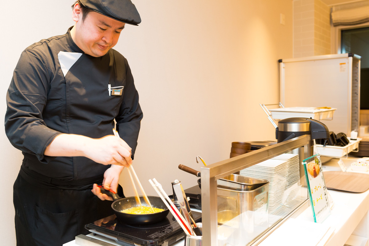 ライブキッチンコーナーでは、シェフが日替わりの卵料理を作ってくれます。この日はプレーンかチーズ入りかセレクトできるふわっとろのオムレツ。