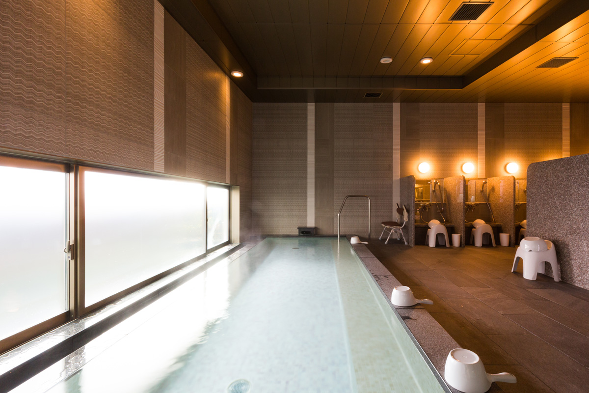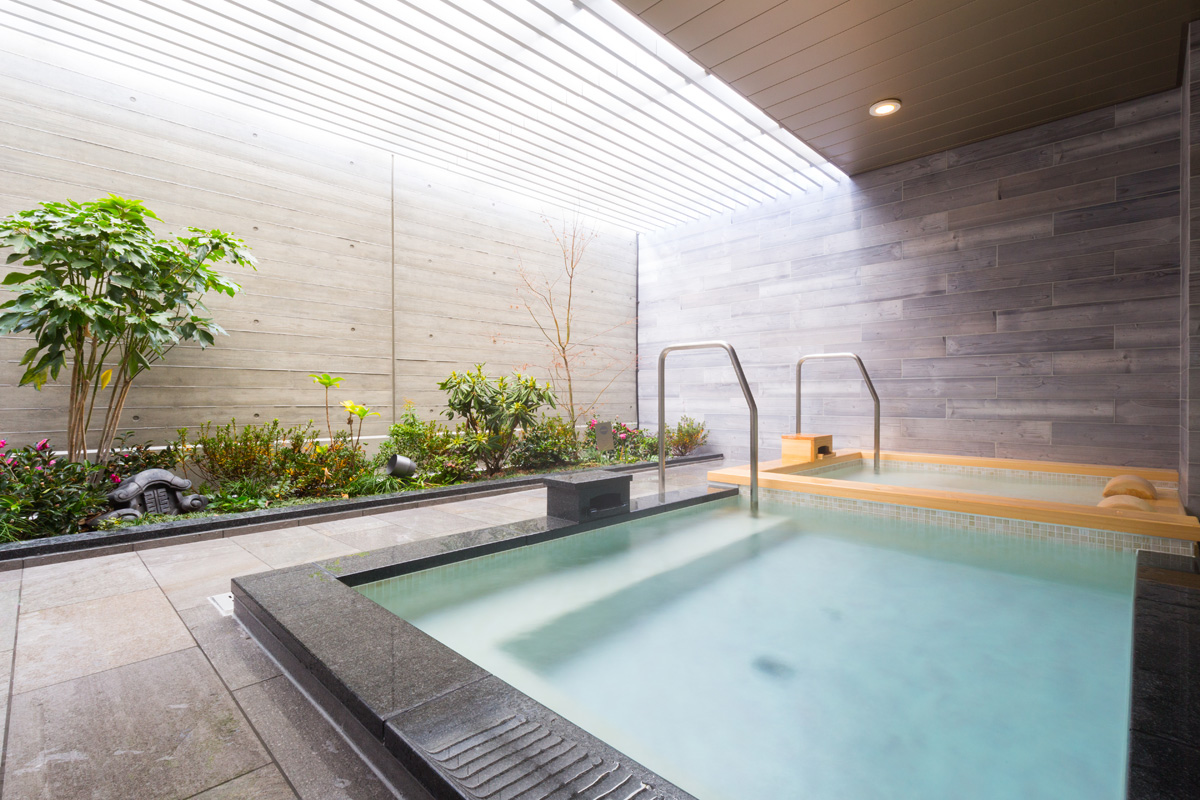 ホテル最上階には露天風呂を備えた大浴場を完備。屋根のある全天候型の露天風呂には、ヒノキの香りが心地よい寝湯と石風呂があり、あまりの気持ちよさに都会の喧騒を忘れていつまでも浸かっていたい。