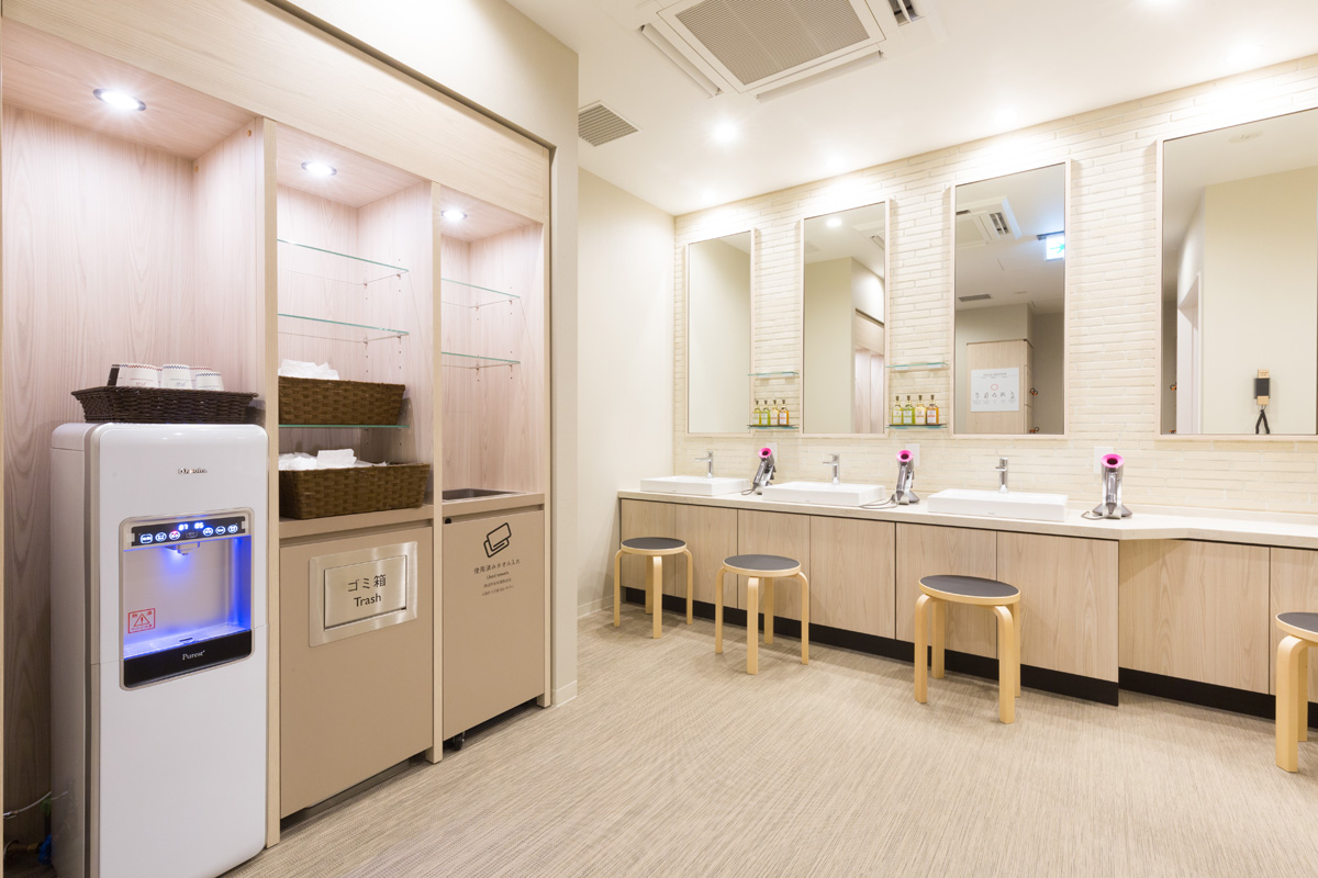 ナチュラルな雰囲気のパウダールームには、「DHC」の人気シリーズ「オリーブゴールド」のアメニティを用意。ボディクリームもあるので風呂上りにたっぷり使いたい。大浴場は女性専用のカードキーをかざして入るので、深夜や早朝一人入浴も安心です。