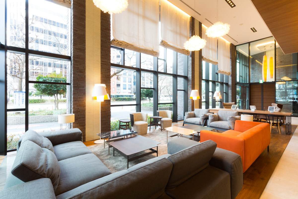 西鉄ホテル クルーム 名古屋のコンセプトは「旅先にある、わたしの家」。旅行先なのに、まるで家にいるようにくつろげるさまざまなサービスを用意しています。天井が高くゆったりとしたロビーは、あたたかみのある色合いのスタイリッシュモダンな設え。座り心地のよいソファでラウンジ風に使用したり、カウンターに常備してあるipadも自由に使えます。
