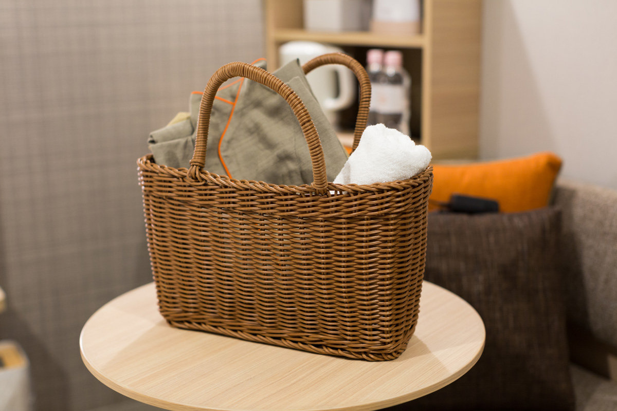 各客室にかわいらしいカゴバックを用意。この中にバスタオルやフェイスタオル、着替えなどを入れて大浴場へ。
