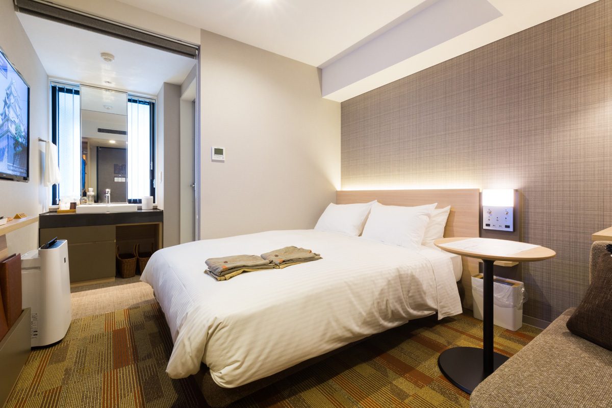 「コンフォートダブル」には、アロマディフーザーやスチーマーが置いてあり、とくに女性に人気の部屋。スキンケアブランド「DHC」の中でもワンランク上の「WAGOKORO」シリーズがアメニティなのもこの部屋ならでは。屋上の大浴場にも着ていけるルームウエアがセパレートタイプで着心地も快適です。