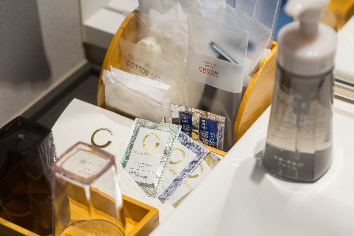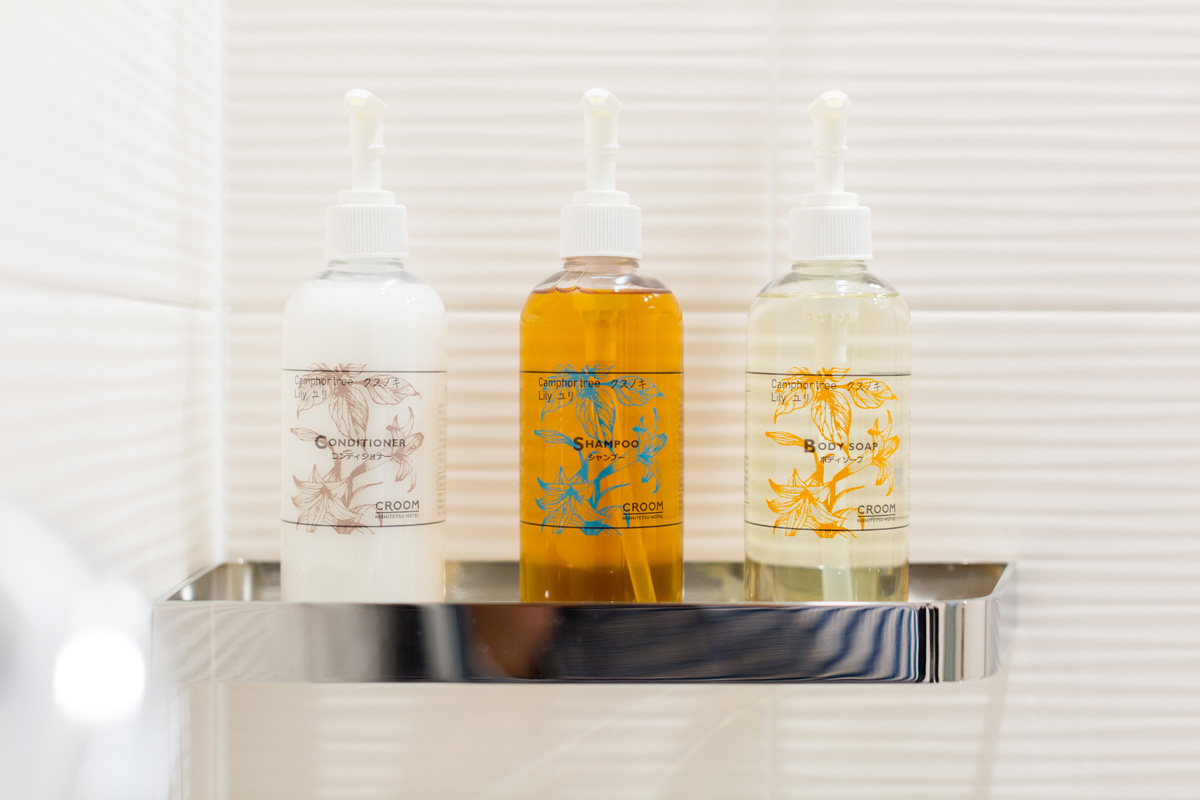 大浴場や客室のバスルームでは、クルーム名古屋オリジナルのシャンプー・ヘアコンディショナー・ボディソープが置いてあります。ユリとくすのきを使った天然成分のアイテムなので、肌の弱い方も安心して使えます。
