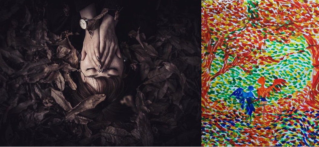 左 yuyu_3.23さんの作品:何かを秘密にしたまま冬の眠りに・・・想像を掻き立てられます。/右 yakshadollさんの作品:紅葉の中を寄り添って歩くカップルの点描画。ぬくもりを感じる作品です。