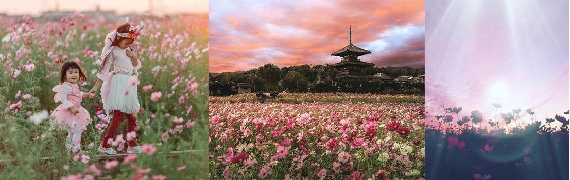 左 rui4050さんの作品/左 odekakephoto7さんの作品/右 photos._.ytaさんの作品:コスモスと秋の夕焼けが艶やかです。これは自然の作るPinkアート。