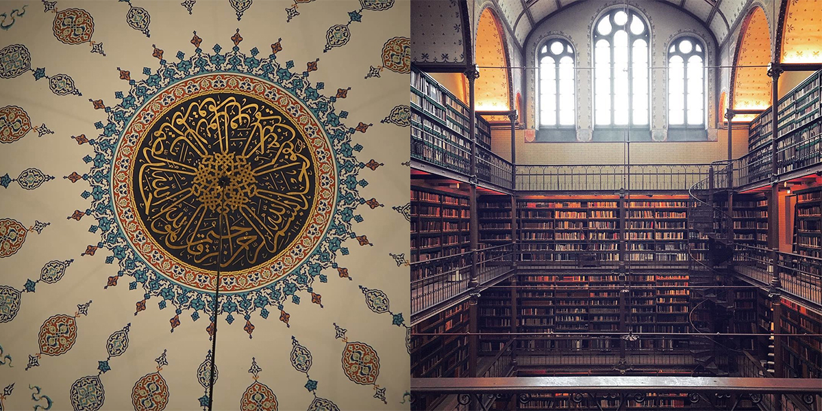 左 jemima825さんの作品:るるぶ&more.の記事でも紹介している東京ジャーミイの天井。/右 hirashioさんの作品:美しい図書館で本に囲まれる幸せ。