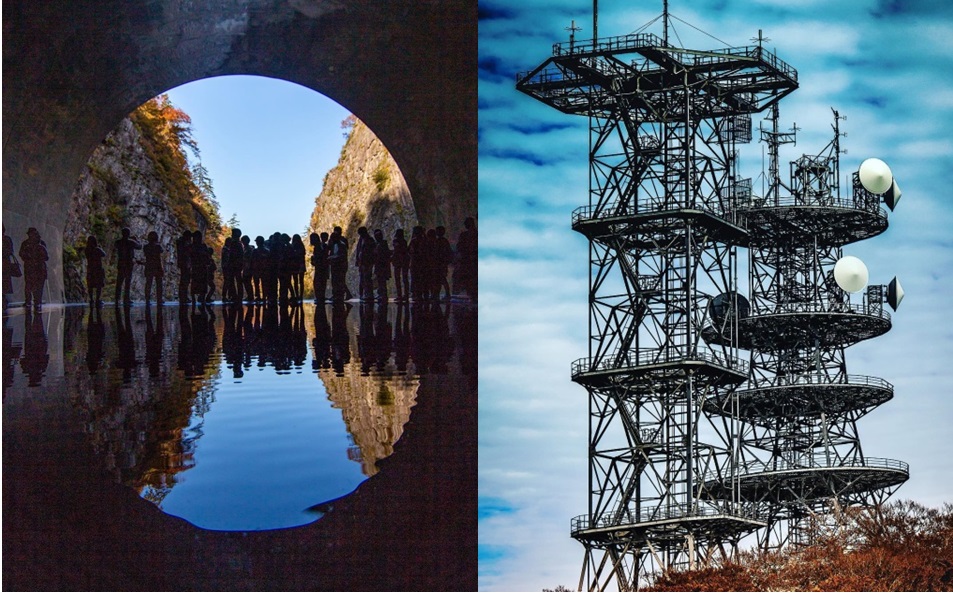 左 natsuinstaさんの作品:清津峡渓谷トンネル。トンネルの中の水面が鏡に!/右 k_wattaさんの作品:鉄塔LOVEです。鉄塔の質感と深い空の色が美しい。