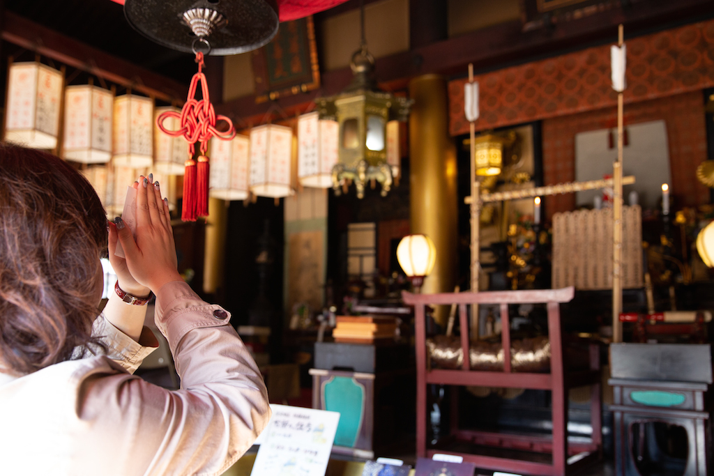 ここでは愛染明王へのお祈りの仕方をご紹介。紙に書いたお願い事を両手でぴったりと挟み、鼻よりも高く掲げます。愛染真言「ウン・シッチ・ソワカ」を一心に唱えながら、目を閉じてお願いしましょう。