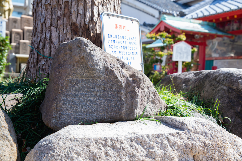 また、密かなパワースポットとして人気を集めているのが「腰痛封じの石」。背もたれの突起に背骨のツボを当てながら呼吸をすれば、腰痛封じに効果があるのだそう。