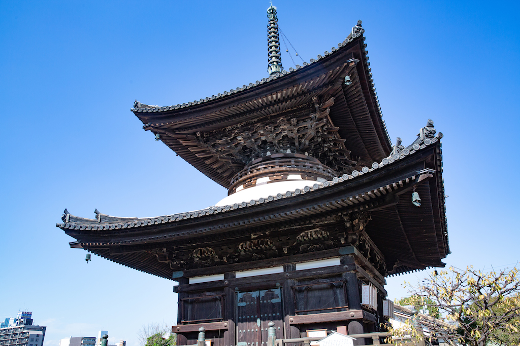 金堂の後ろにそびえ立つ多宝塔は、1597年に豊臣秀吉が再建した大阪市最古の木造建造物として、国の重要文化財に指定されています。