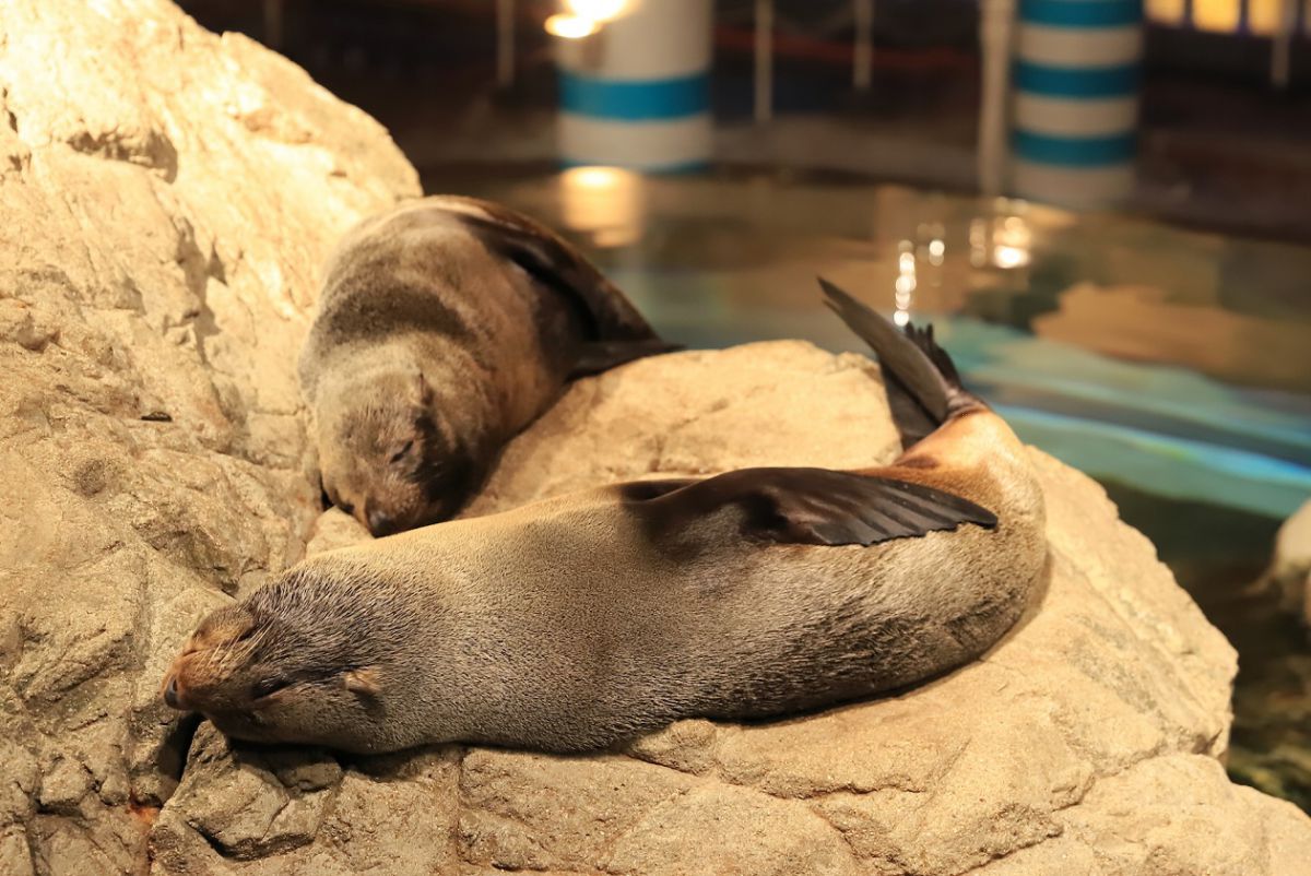 「冬の夜のすいぞくかん」は、夜行性のオオサンショウウオが活発に動く姿や、オットセイやペンギンが寝ているようすなど、いきものたちの夜ならではの姿をつぶさに観察することができます。