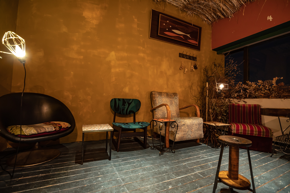 形も色も違う座り心地の良さそうな椅子、アンティークなランプなどが、静かな空間を演出。夜景を見て、ゆっくりお酒を飲みながら読書できる至福の場所です。