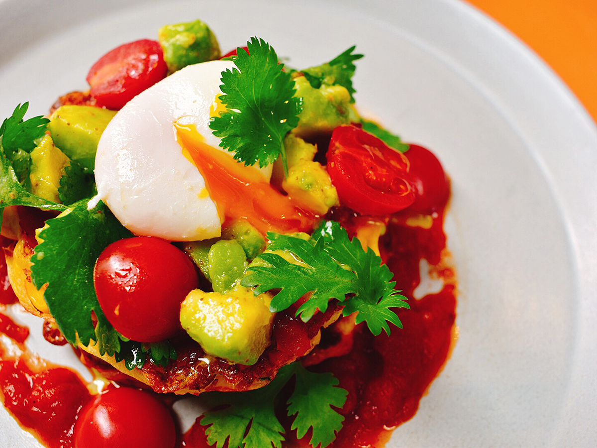 優しい味わいのパンケーキを、濃厚なアボカドとスパイシーなトマトジャムが引き立て絶妙なおいしさに。色鮮やかなアートのようなひと皿は、思わずうっとりしてしまう美しさですね。
