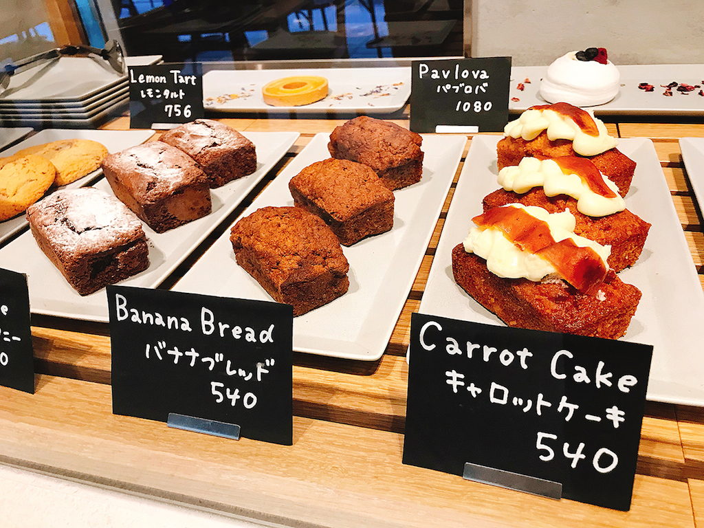 ブランチだけでなく、おやつにピッタリなスイーツが充実しているのも魅力です。店内のショーケースには「キャロットケーキ」(594円)や「バナナブレッド」(594円)など、目にもおいしそうな焼き菓子がずらりと並んでいます。