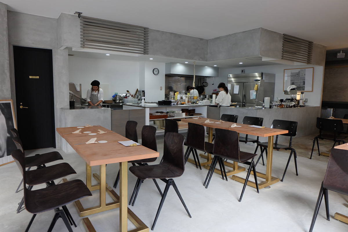 店内奥には、ライブ感漂うキッチンが印象的。オープンな空間にしたいとオーナーが一番こだわった場所でもあります。コンクリート調のシンプルな雰囲気に、個性的なテーブル、椅子が空間に彩りを添えます。