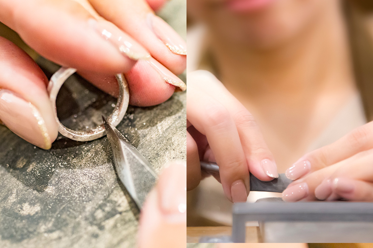 リングの側面も紙やすりで磨きます。今回選んだのはクリア仕上げですが、マットやヘアライン仕上げの場合は、金たわしのような材質のやすりも使用します。内側をヘラという道具でなでると、輝くように光ってきました。