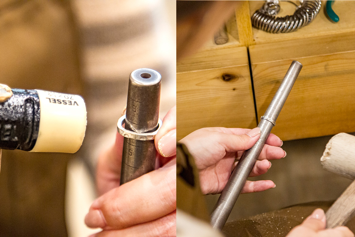 芯金にリングを通し、プラスチックハンマーでゆがんだ箇所をトントンと叩くと、あっという間にきれいな円形に。木槌に持ち替えて、リングを下方向に叩き、希望のサイズの箇所まで輪の大きさを徐々に広げていきます。ひとまずリングの形はこれで完成。