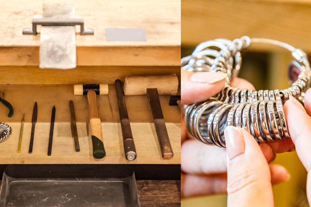 作業台の下の棚には、1名分ずつ使用する工具がきちんと整列。着ける指に合わせて、1~30号まであるリングゲージでサイズを測りましょう。女性同士の体験だと、ピンキーリングにする人も多いんだとか。どの指のリングでも料金は据え置きです。