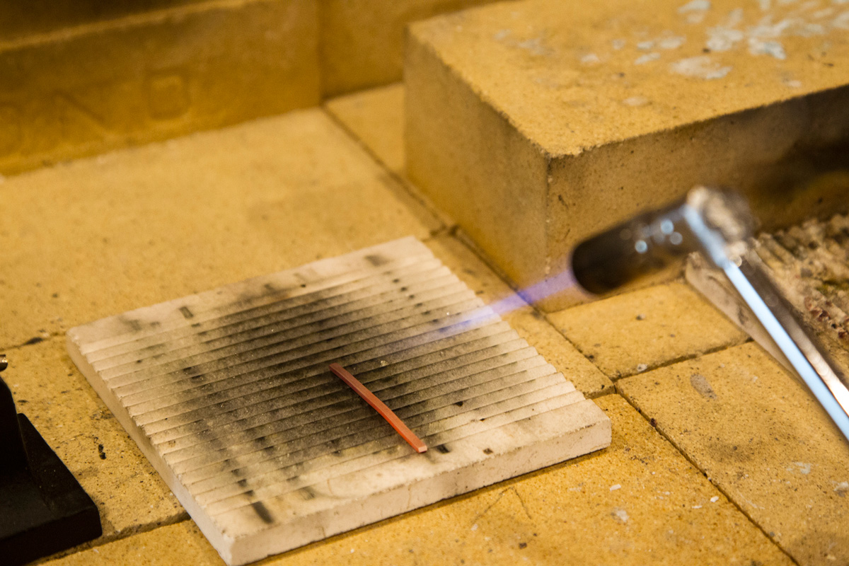 いよいよ作業工程に突入。細い棒の状態のシルバーを柔らかく加工しやすくするため、ガスバーナーで熱します。全体が白から赤に変わったらOK。