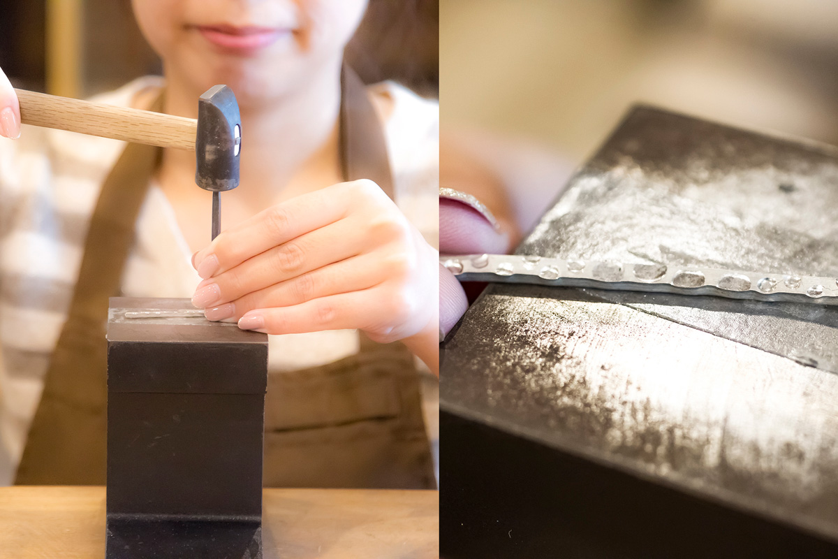 槌目を選んだ場合は、金づちでカンカンと叩きながら模様を刻印します。打つ模様は小丸や大丸、やや四角いものなど10種ほども。どれをどこに入れるか、模様の間隔、凹の深さも自分次第!