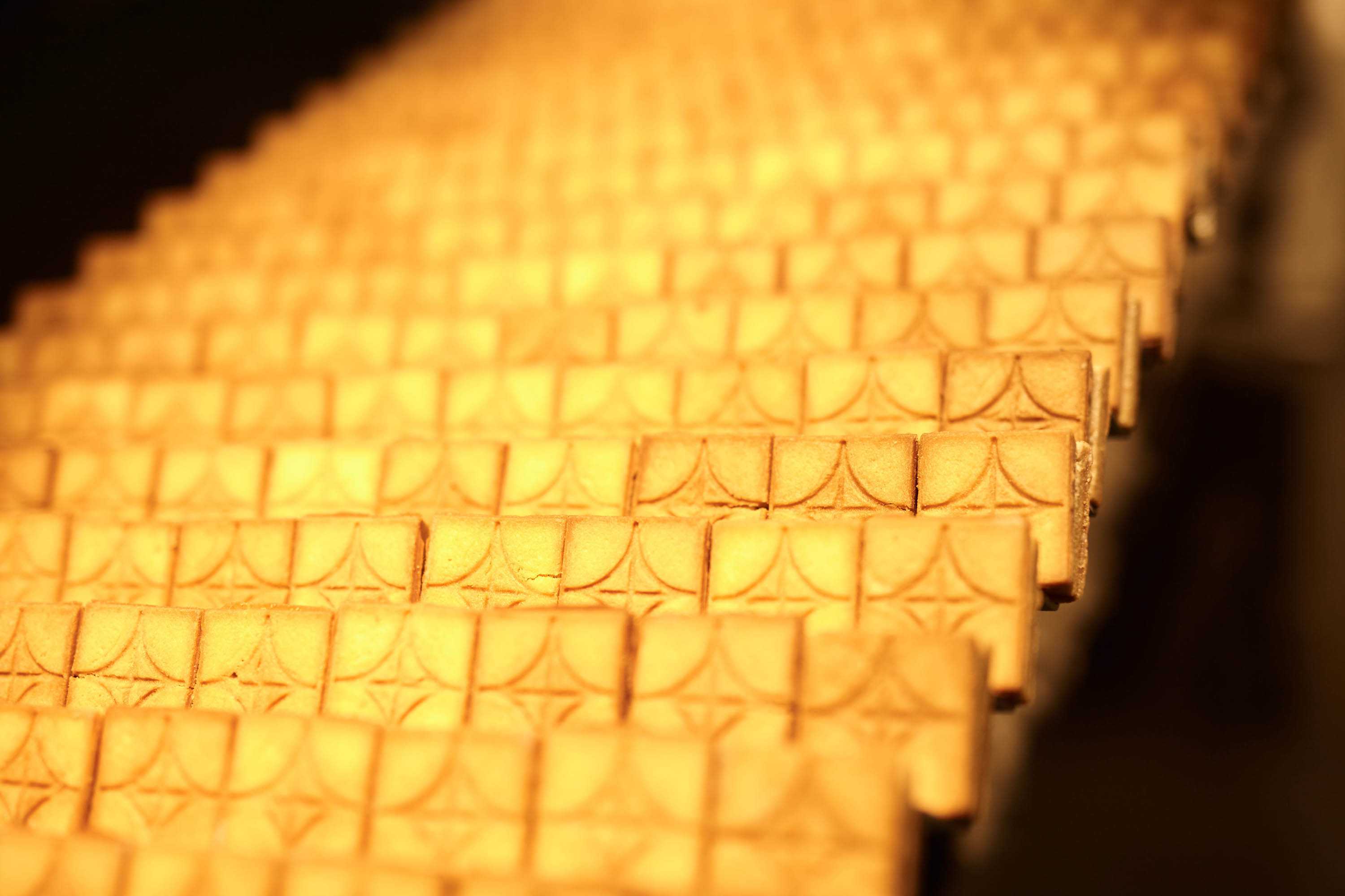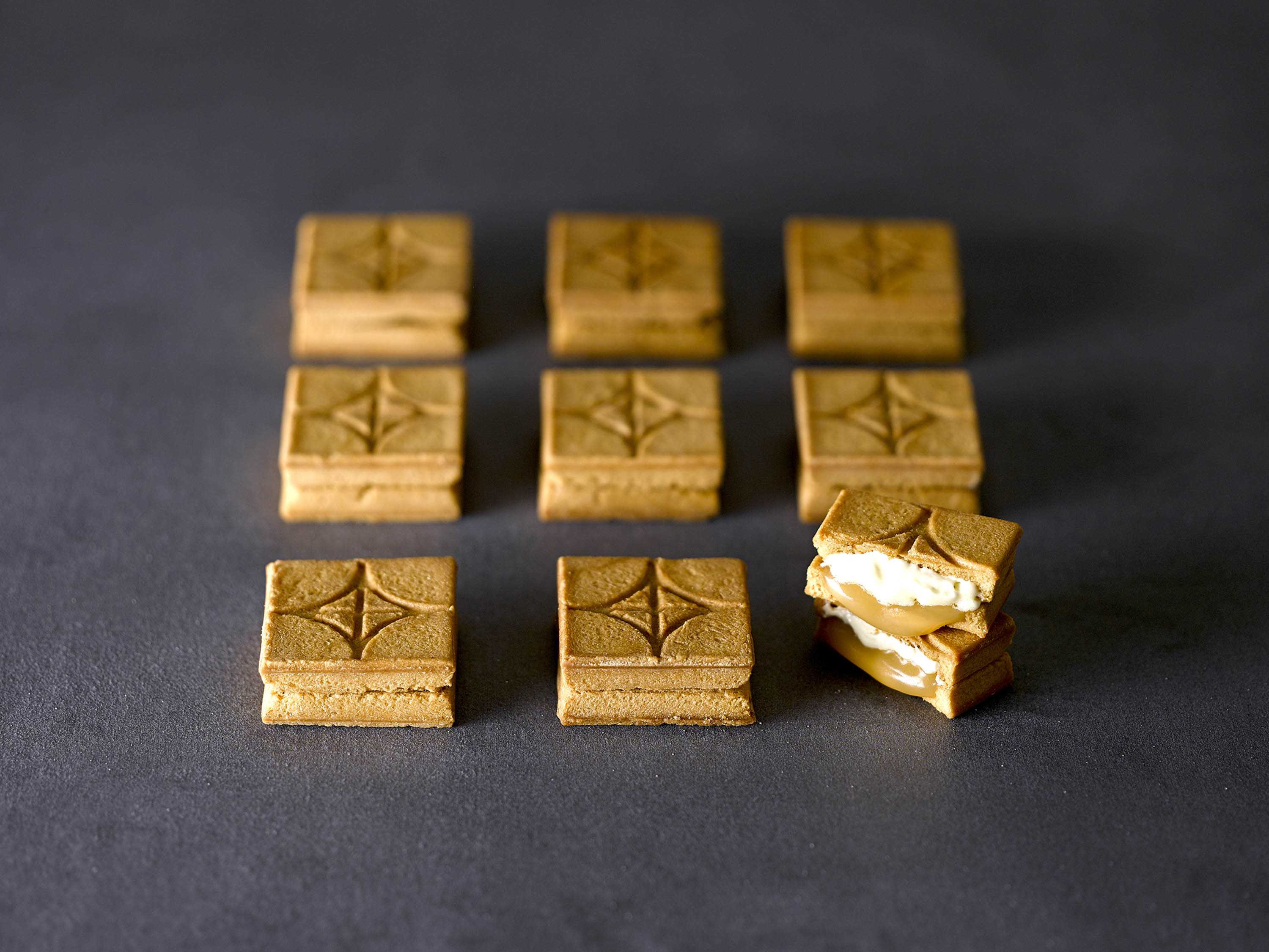表面にプレスされた模様は、食べやすく割れるように設計されたもの。また、クッキーがボックス型に作られているのは、中のフィリングがはみ出さないようにするためだそうです。食べやすい工夫がされているのは、嬉しいポイントですね。
