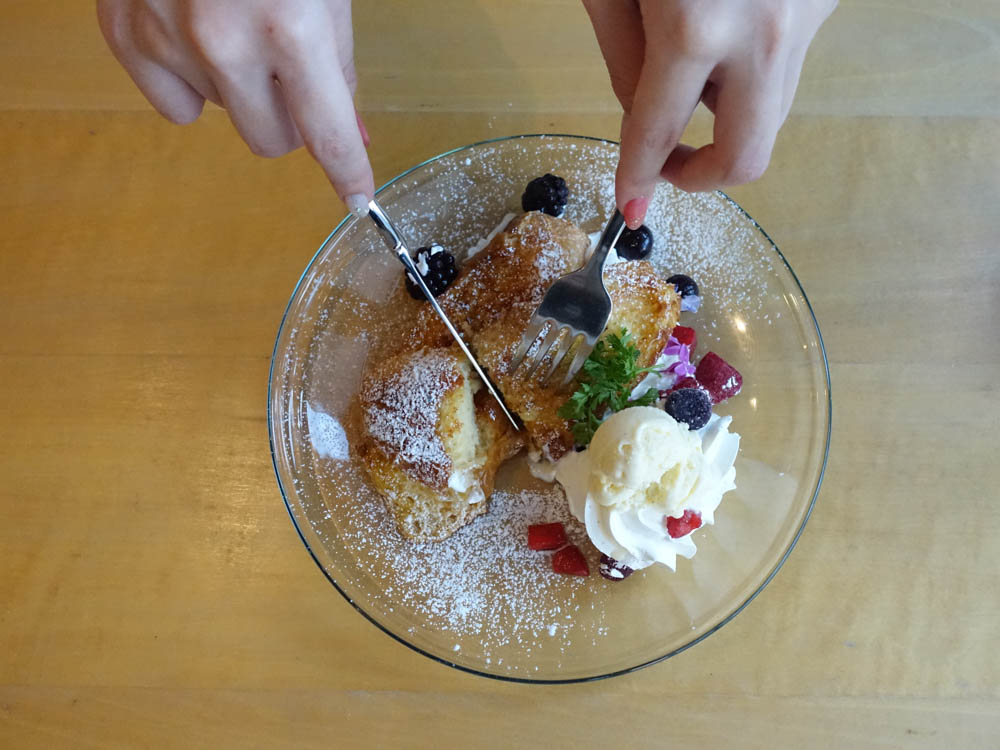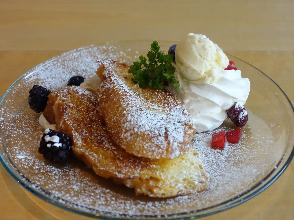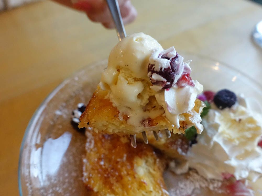 アイスクリームをのせて食べてみると、バニラの風味と優しい甘さのフレンチトーストが絶妙なバランス。さらにフルーツものせて食べると、もうこれは贅沢な美味しさです。