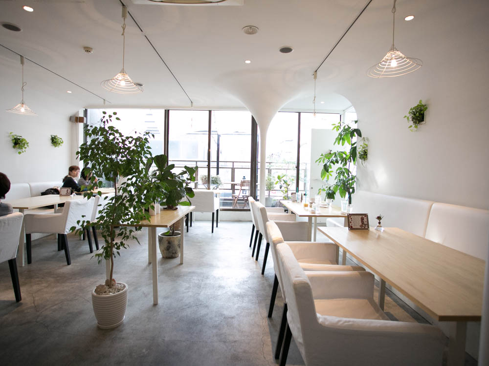 店内に入ってみると、壁や椅子まで白で統一された空間が広がっています。緑の植物がところどころに置いてあり、開放的で気持ちのいい空間です。