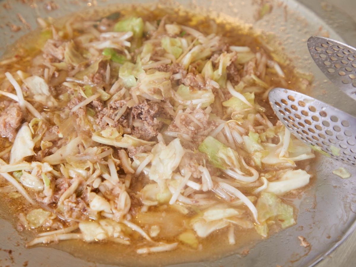 お肉と野菜のうまみが鍋全体に浸透して、中心部がぐつぐつしてきたら、一回目の食べごろ!ロースやランプ肉、キャベツ・モヤシ・オニオンスライス・万能ネギなど秘伝のスープに浸かった、うまみ満載の具を召し上がれ。