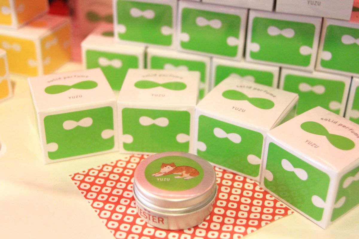 お店に入ったら店内をぐるりと見回してみて。どの商品もパッケージがかわいいんです。長崎らしさやレトロ感あるパッケージが地元女子を中心に大人気。写真は、オリジナル商品の練り香水で、“てふてふと猫シリーズ”。レモン、石けん、チェリーブロッサム、ローズ、ゆずの5種類の香りがあり、肌につけるとふんわりやさしい香りが気持ちを華やかにしてくれます。