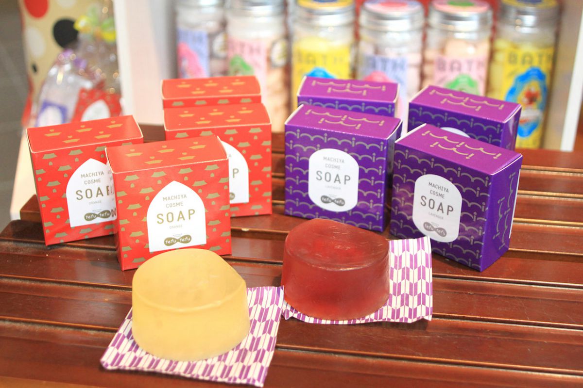こちらは色合いも素敵な石けん。長崎県産椿油配合、敏感肌にもやさしい使い心地で、もっちりスベスベ肌に仕上がります(各1350円)。ラベンダー、オレンジ、レモングラスの3種類の香りがあり、眼鏡橋、お寺、電車をモチーフにした長崎柄パッケージは、お土産にもおすすめです。