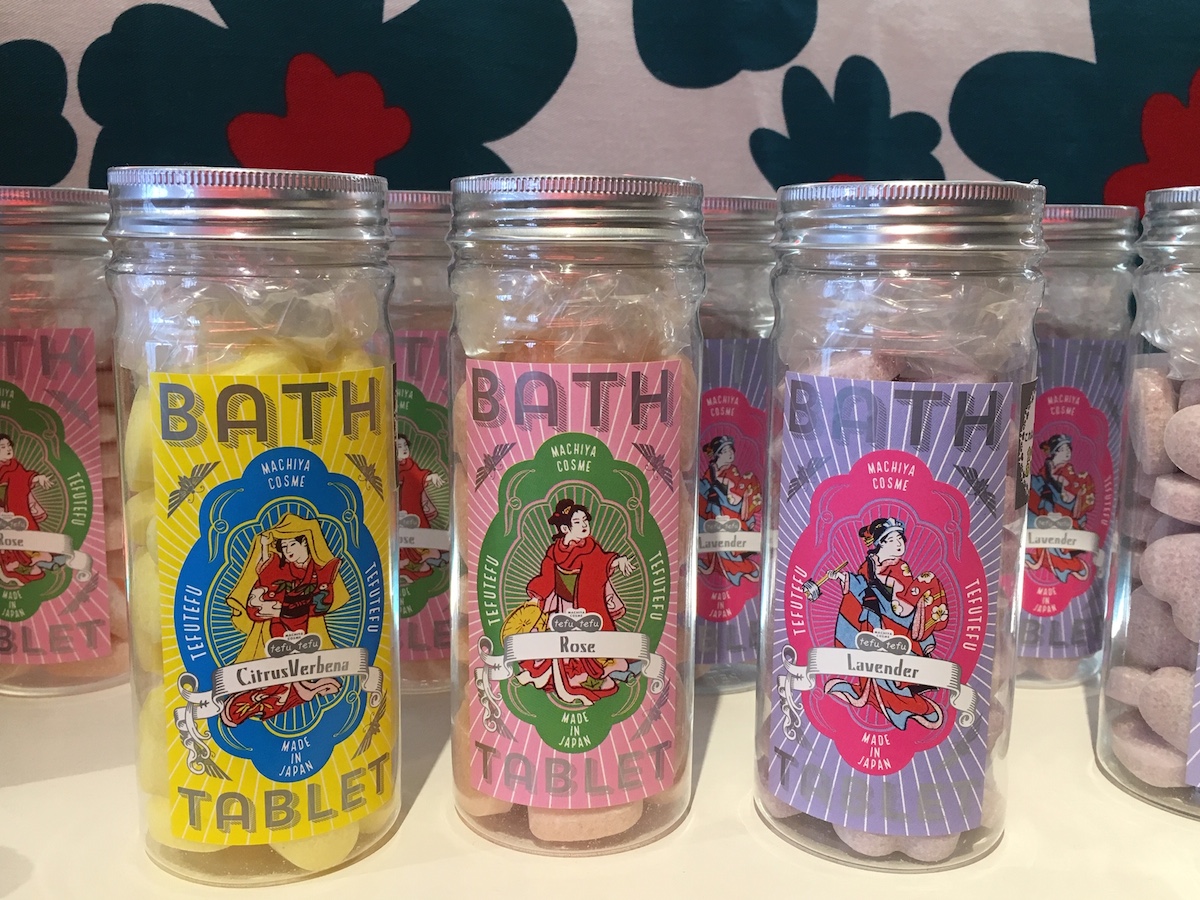 個性的な和テイストのイラストが印象的なボトルの中には、ハート型のバスタブレットが入っています(1瓶1620円)。ミネラル豊富な長崎県五島の塩、美容成分の椿油などを配合していて、血行促進効果もあり、これからの寒い季節におすすめ。香りは、ローズ、シトラス、ラベンダーの3種類。4粒入りのお試し用サイズ(3種セット 550円)もあり、プチお土産としてもおすすめです。