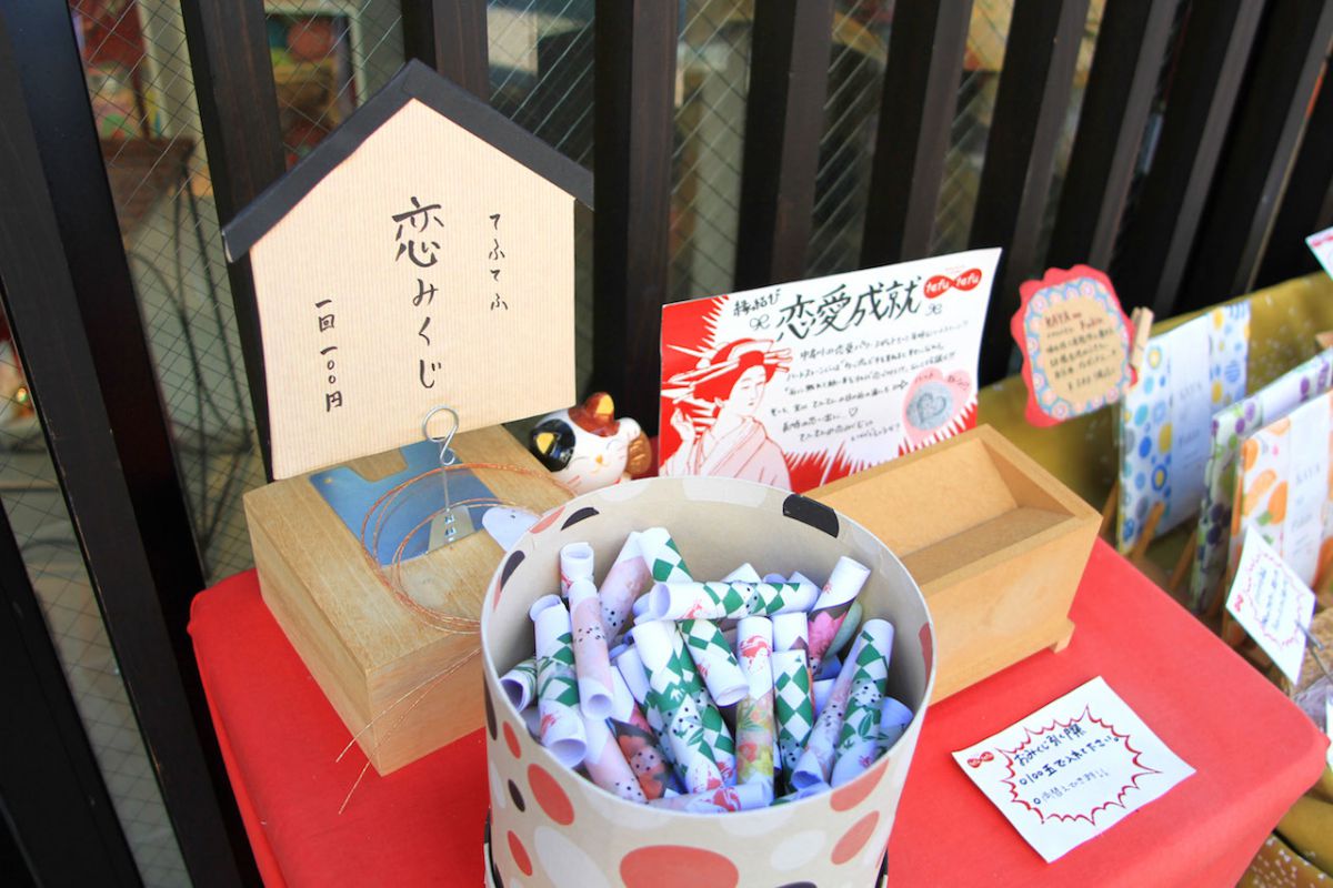 店先には恋愛成就の恋みくじ(1回100円)もあります。恋してる人も探している人も、運試ししてみてください。