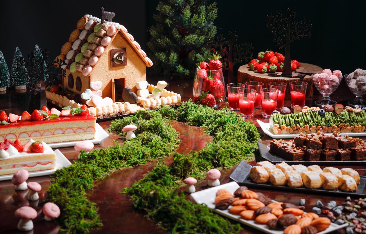 グリム童話『ヘンゼルとグレーテル』の物語をモチーフとしたかわいいお菓子の家のディスプレイや、いちごとチョコレートで迷いの森を製作。絵本の中の世界に入り込んだような楽しいスイーツをたっぷりと味わえます。