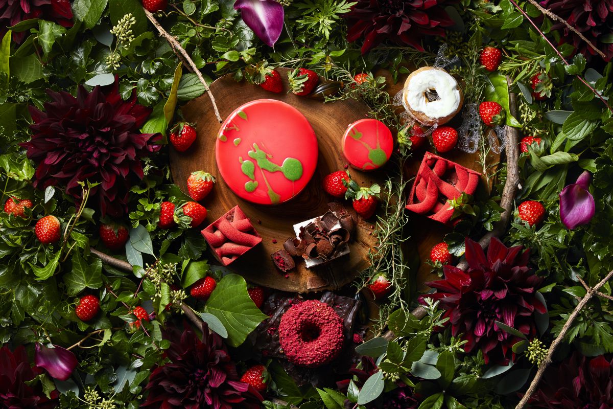 小さないちごの森(Grove of berry)をイメージした、赤・茶・白の3色のテーマカラースイーツといちごが並ぶビュッフェ台はなんともフォトジェニック。緑色の中に、いちごスイーツの赤色が映えます。