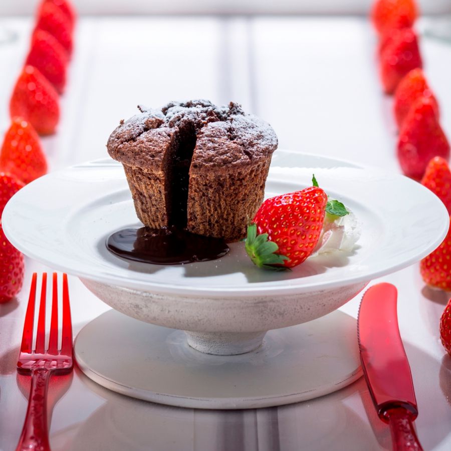 ナイフを入れると温かいチョコレートがトロリと出てくるのがいちごのフォンダンショコラ。実演メニューならではのできたてを味わえます(1日2回)。