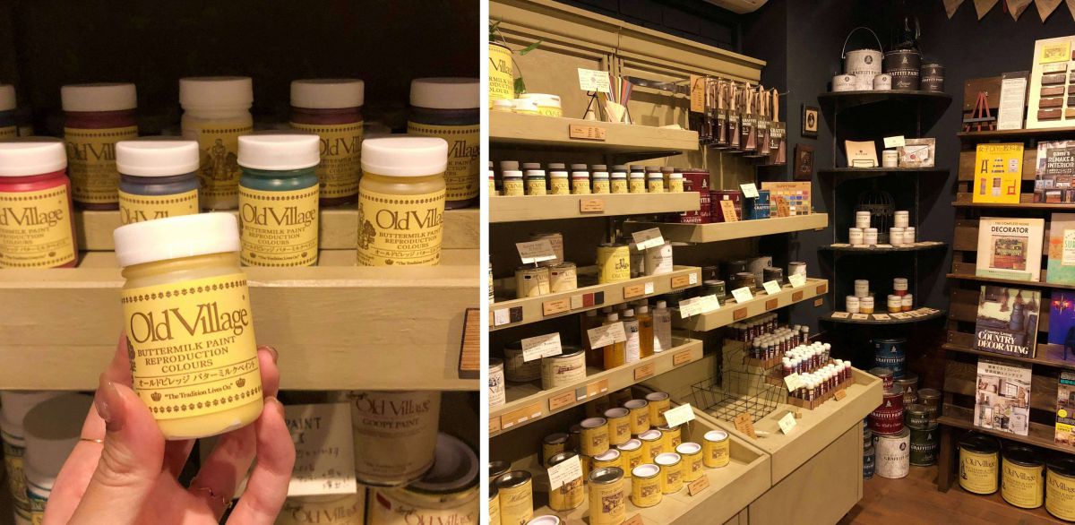 店内では、アメリカからの輸入塗料であるバターミルクペイントをはじめとしたDIY商品が売られていてびっくり。しかし、「塗料の匂いがするのでは…?」なんて心配することはありません。こちらのバターミルクペイントの主成分は天然で身体にも優しく、匂いも安全性も問題ないんだとか。