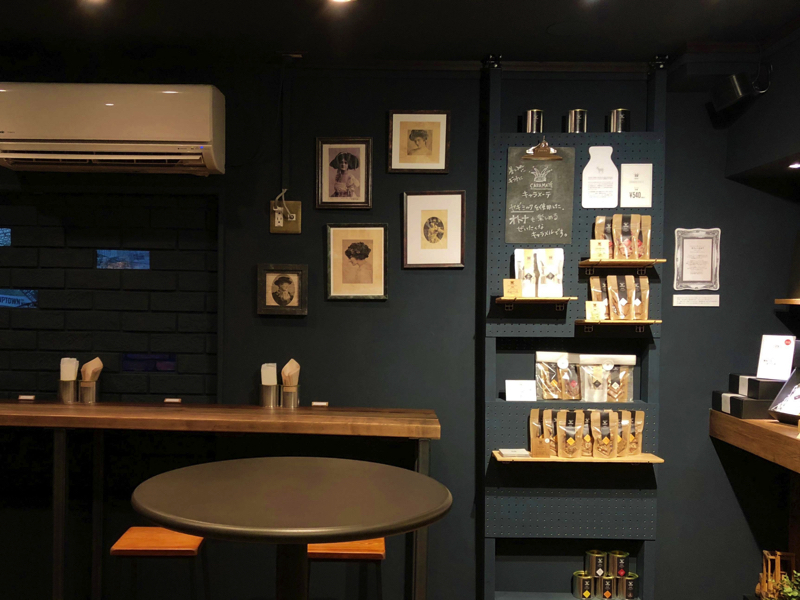 ダークネイビーを基調とした、おしゃれで落ち着いたカフェスペース。店内の壁は、販売している塗料を使って仕上げられているのだとか!居心地の良さも人気で、ランチ後のブレイクタイムに利用する方も多いようです。