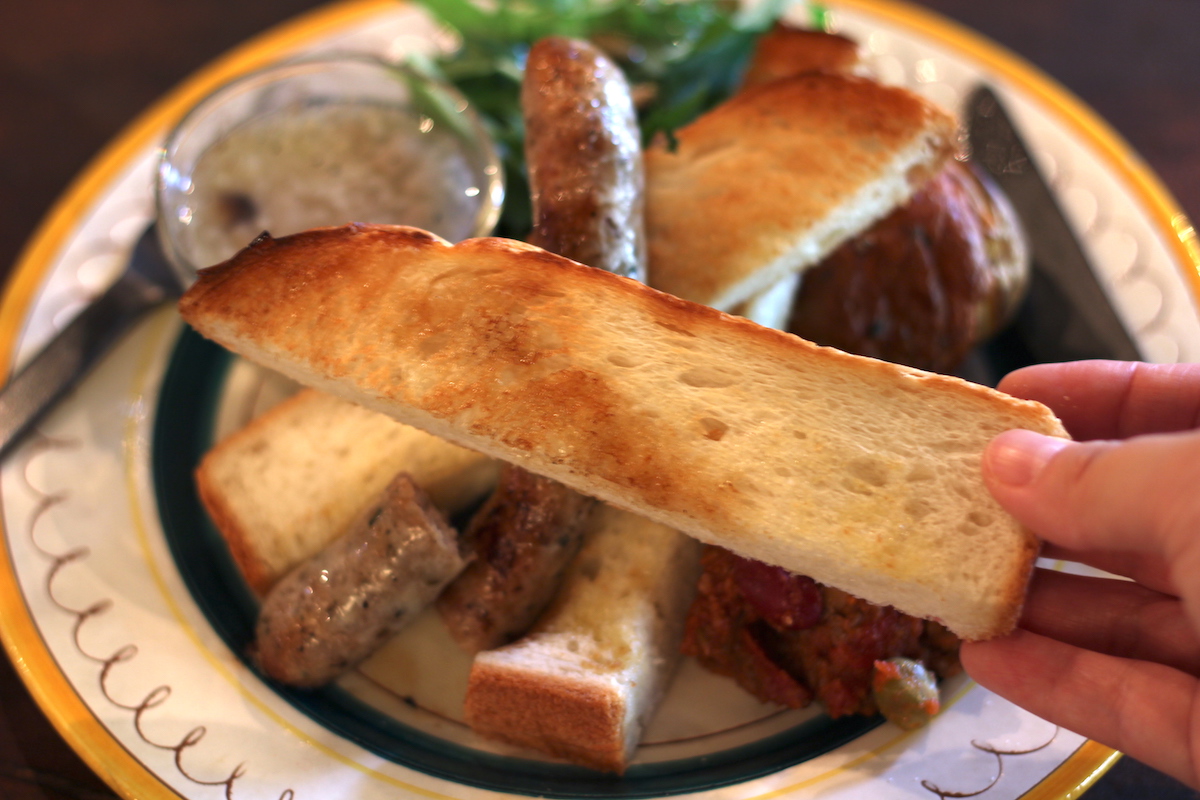 サクッと焼かれたトーストは、キメ細かさを感じながらふわふわとした食感でたまらないおいしさ!肉汁あふれるジューシーなソーセージや、トマト香るチリコンカンとの相性も絶妙で、バランスの取れた一皿です。