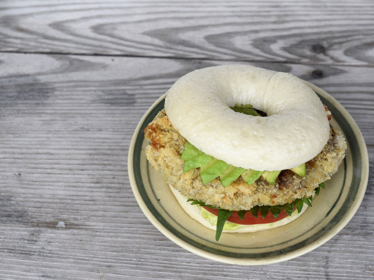 いよいよお目当てのベーグルランチ。4種類のベーグルサンドの中から、マクロビのレシピをアレンジした「くるま麩のベーグルサンド」を選びました。たっぷりの具を挟んだベーグルのボリュームにびっくり!口をめいっぱい開けてかぶりつきます。