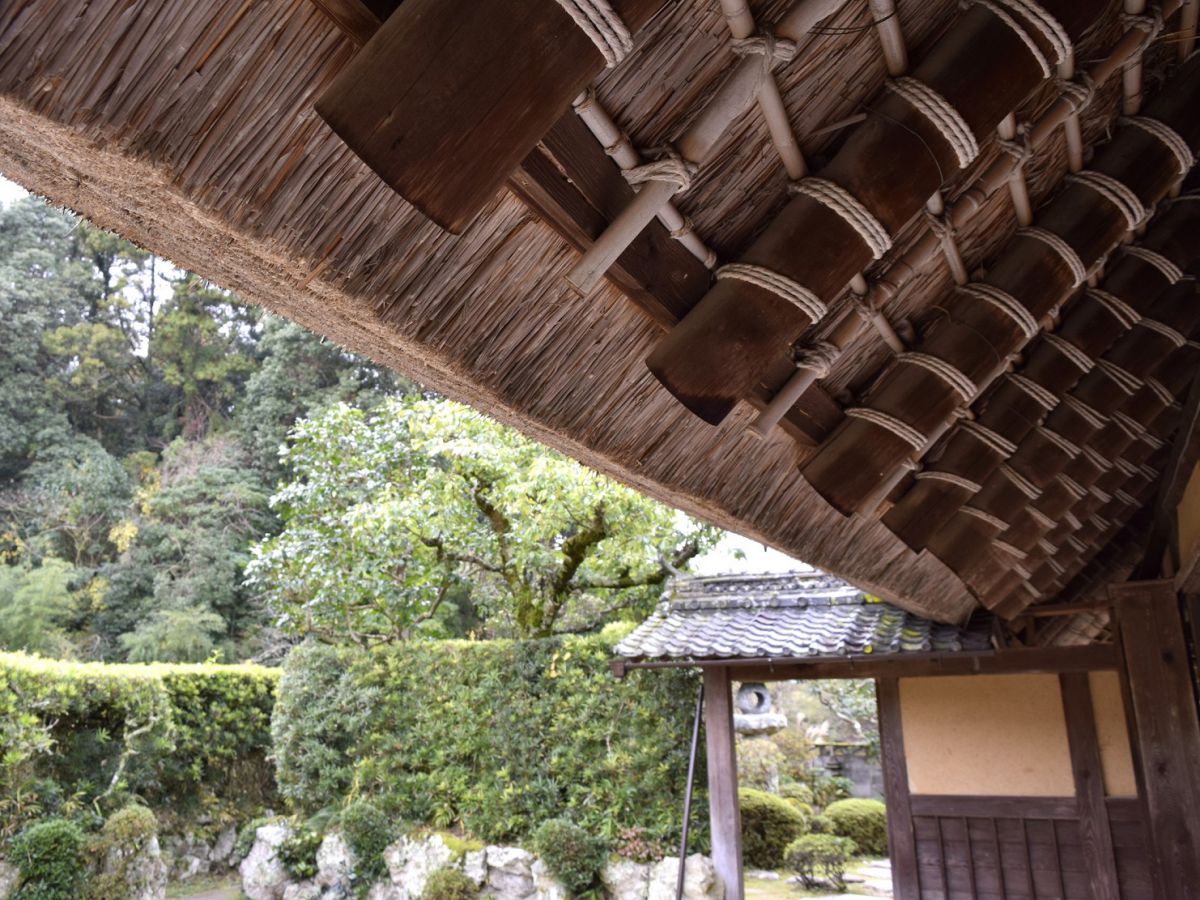 縁側から見上げると、かやぶき屋根の軒がとってもきれい。目の前には広い芝生の庭、中庭は日本庭園、そして外に広がる里山の景色を楽しめます。