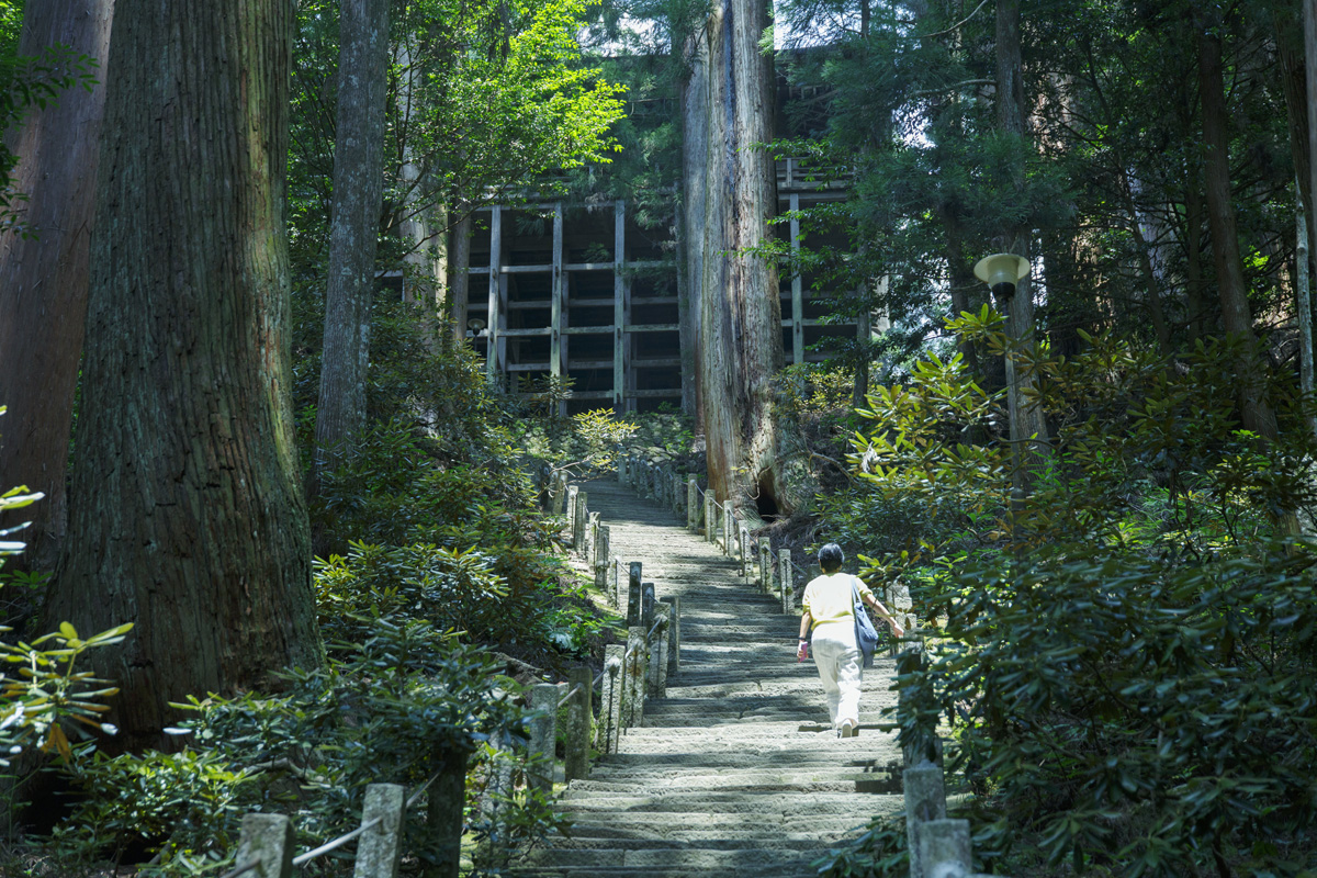 参拝の最後に訪ねたいのが、五重塔のさらに奥、720もの長い石段を登りきった先に建つ「奥の院」。こちらでは、真言宗の開祖 弘法大師が祀られています。石段の途中には、岩と一体化したような巨大な樹木もあり、悠久の歴史を感じるはず。