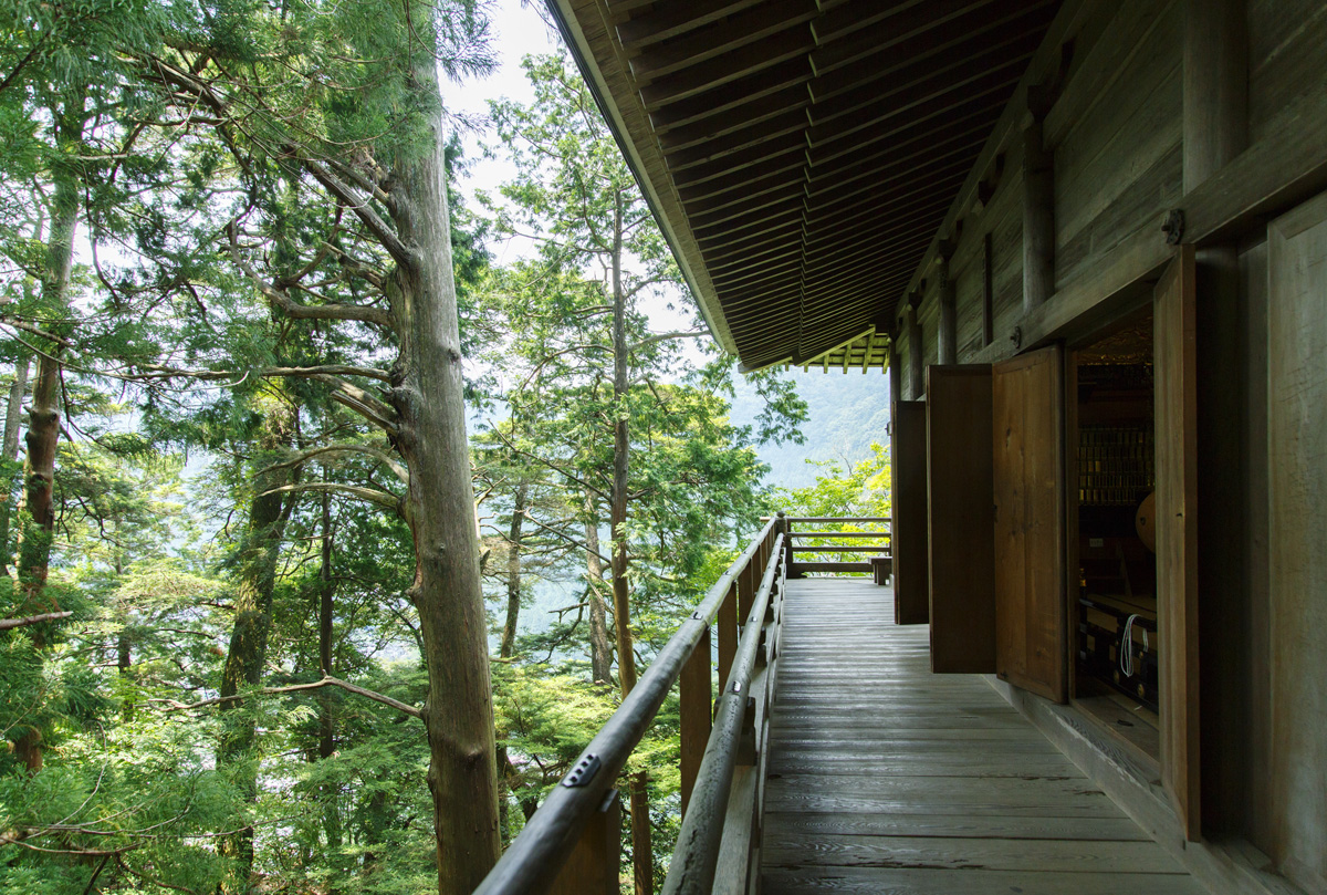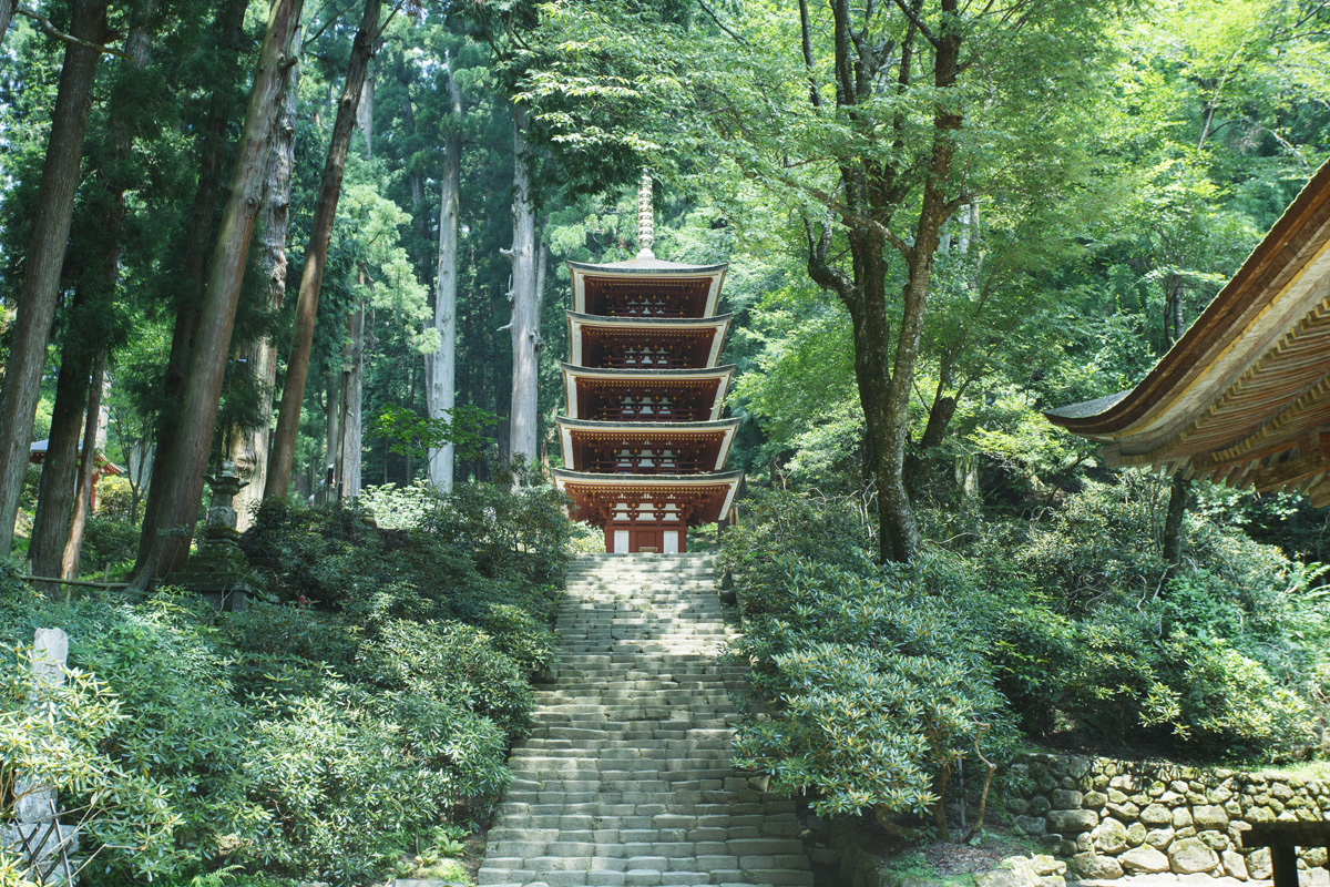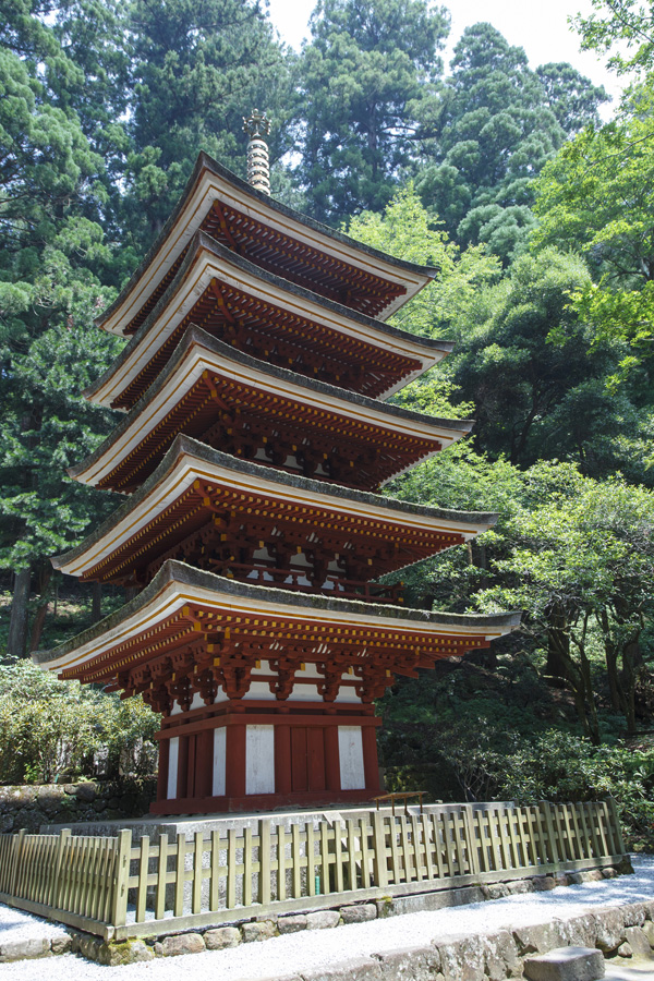 山の斜面に沿うように広がる境内で、ほれぼれと見とれてしまうのが国宝・五重塔。高さ16mと小ぶりで、森の中にそっとたたずむ優美な姿は「日本一小さく、美しい五重塔」として知られています。奈良時代に建てられて以来、一度も焼失していないというのも驚きです。