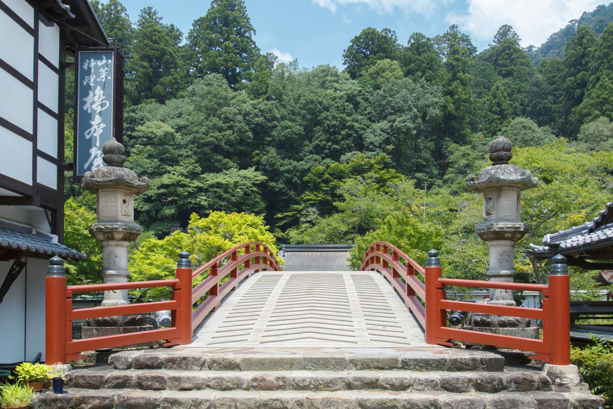 室生寺は、真言宗室生寺派の大本山。奈良県北東部、奥深い山と渓谷に囲まれた宇陀・室生エリアにあります。奈良市内からは車で1時間ほど。おみやげ店や旅館が並ぶ門前町を抜け、朱塗りの太鼓橋を越えると山門へ到着です。