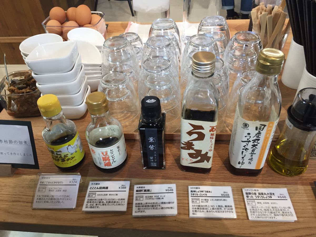 また、おぼろ豆腐や卵かけごはんには、たつのの醸造元8社から選りすぐった醤油スタンドから、お好みを選んで味わえます。