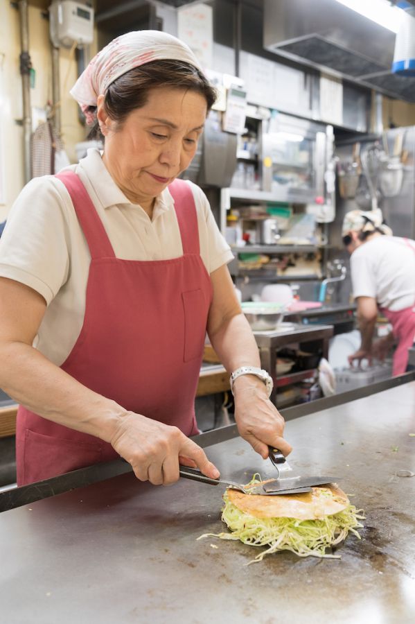 お好み村はほぼ全席鉄板カウンターなので、焼く様子を目の前で見られます。スピーディーで無駄のない、圧巻のコテ捌きは必見!鉄板から直に食べられるのもポイントです。
