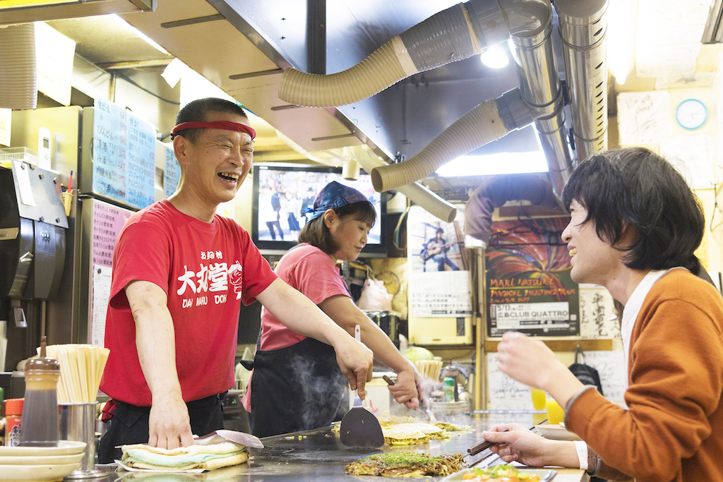 4階にある「大丸堂」は、中華を中心に約50種類の多彩な鉄板焼メニューが揃う居酒屋系お好み焼店。深夜2時(日曜、祝日は~24時)までと遅くまで営業しているので使い勝手も抜群。陽気な店主・大野さんとのトークも魅力です。